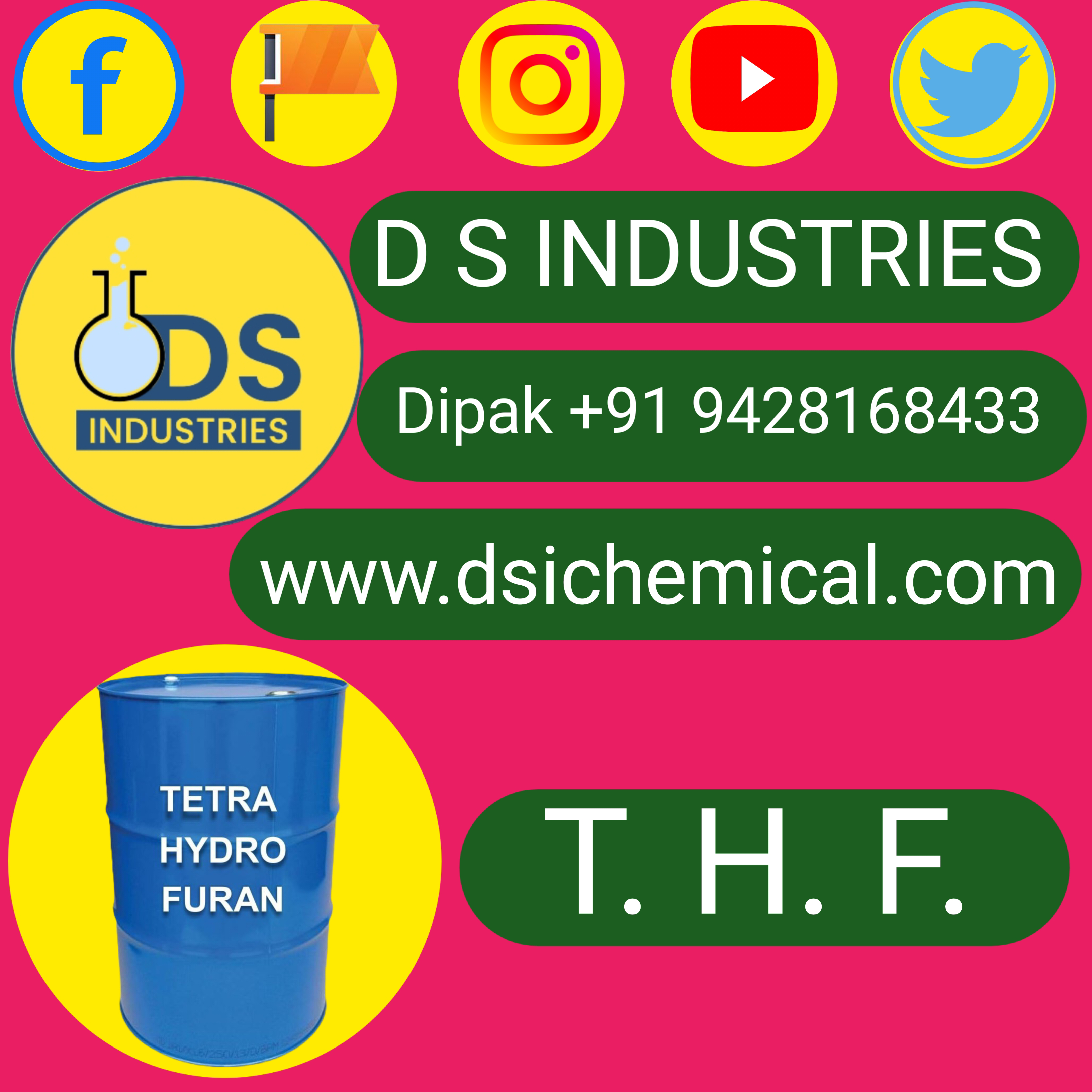We Leading D S INDUSTRIES Best Tetrahydrofuran Supplier in the Vadodara Gujarat india.Accurate ( THF) delivery all over india. Tetrahydrofuran (THF), also known as oxolane, is a colorless, organic liquid with a low viscosity and ether-like odor. It has the chemical formula (CH₂)₄O and is miscible with water and most organic solvents. THF is a versatile solvent with a wide liquid range and polarity, making it useful in many industries: Laboratory organic synthesis THF is used as a solvent in organic synthesis and chromatographic analysis. Industrial products THF is used in industrial products such as varnishes, surface coatings, anticorrosion coatings, and printing inks. It is also used as a precursor to polymers, adhesives, and synthetic fibers, resins, and rubber. Pharmaceuticals THF is used in the pharmaceutical industry for the synthesis of carbetapentane, rifamycin, progesterone, and some hormone drugs. Key word Tetra hydro Furan ( THF) Safety Precautions Laboratory Pharmaceutical Resin Coatings Varnish Best THF Supplier D S industries (THF) D S industries Vadodara